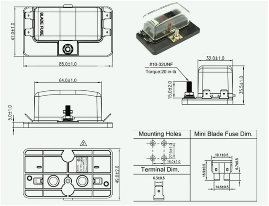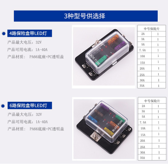 独特带LED指示灯设计,接通电路插入保险丝正常情况下指示灯不亮。保险丝出现异常指示灯亮,未插入保险丝指示灯亮。更换保险丝后继续工作,保险盒不受影响。