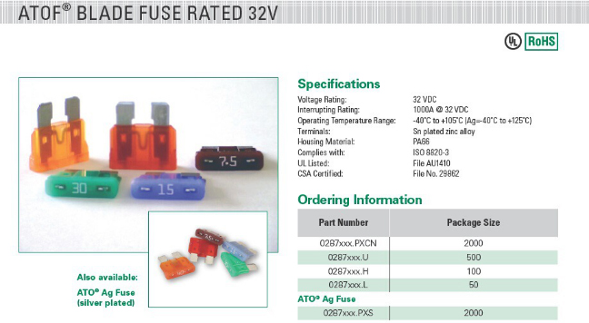 Littelfuse开发的ATOF®保险丝专用于汽车工业,现已成为国内外汽车和卡车的原始设备电路保护标准。 此款易于识别和更换的保险丝可满足多种低电压电子应用的需求。